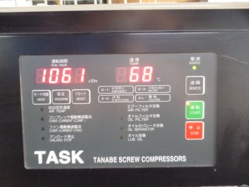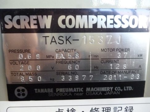 田辺コンプレッサ37kw(50馬力)60hz 標準機ドライヤー無し メンテナンス直近